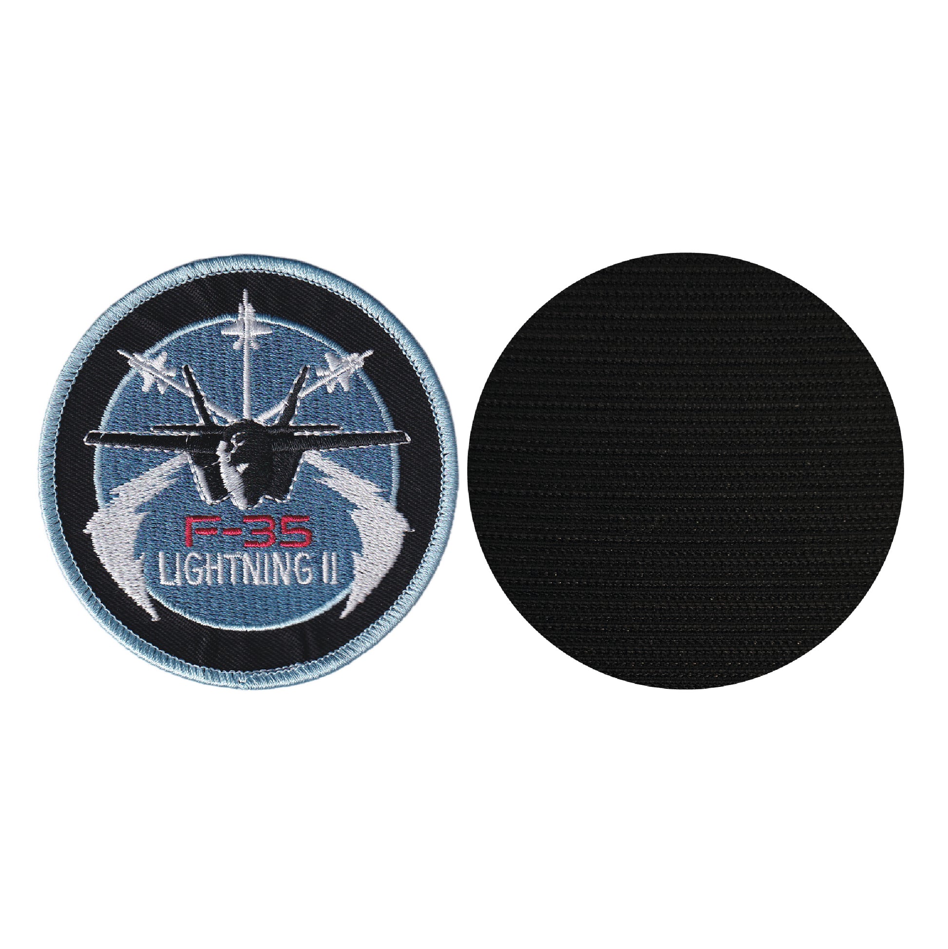 MAXIMUMPATCHES - Diamètre 8 cm - Ecusson Patch Brodé Avec Scratch Cousu Au Dos + Carré Scratch A Coudre, Face Opposé 10 cm x 10 cm Offert/Avion Militaire F-35 F 35 Lightning