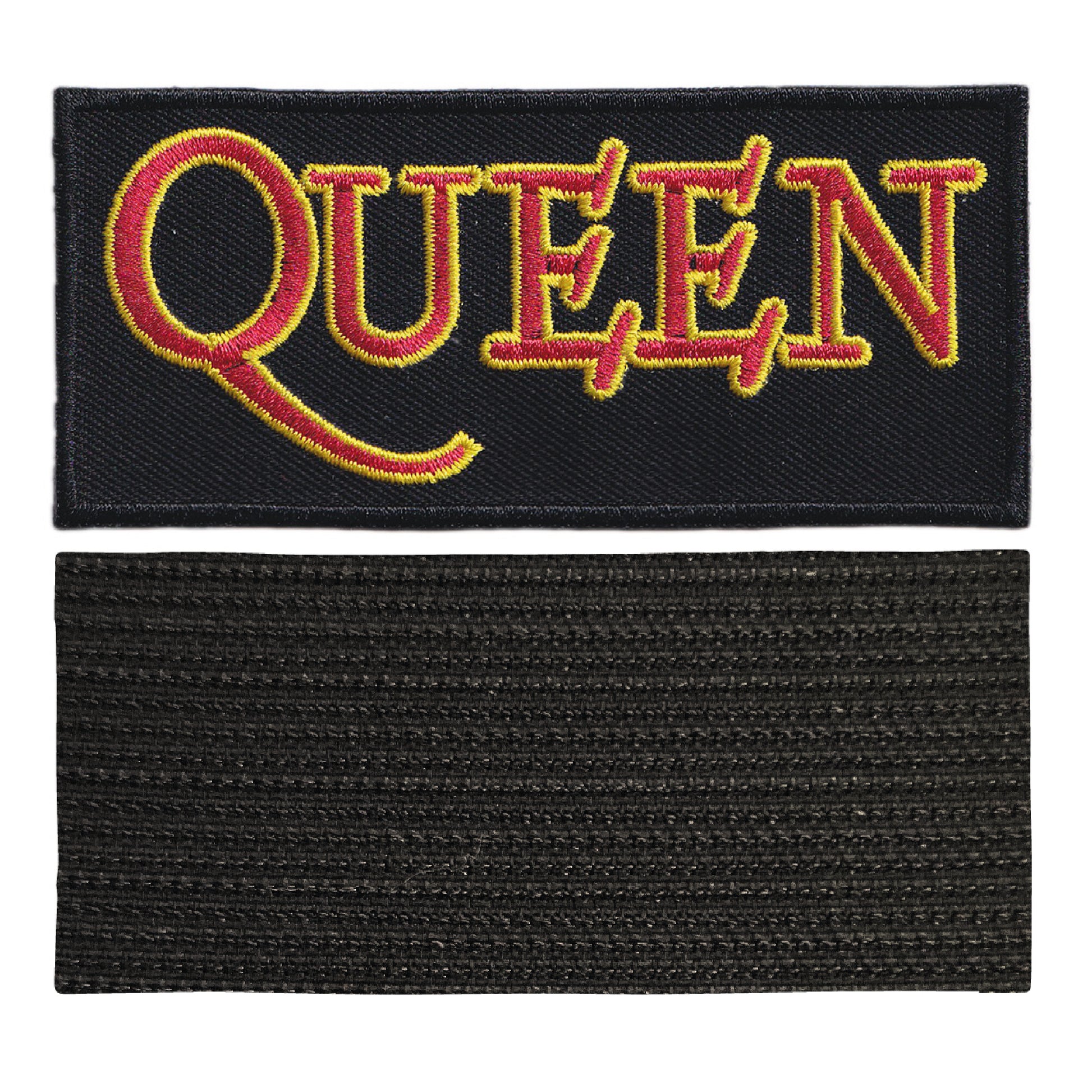 MAXIMUMPATCHES - Queen - 9,8 cm x 4,5 cm - Ecusson Patch Brodé Avec Scratch Cousu Au Dos + Carré Scratch A Coudre, Face Opposé 10 cm x 10 cm/Groupe Musique Métal Rock Punk Heavy Trash Blues